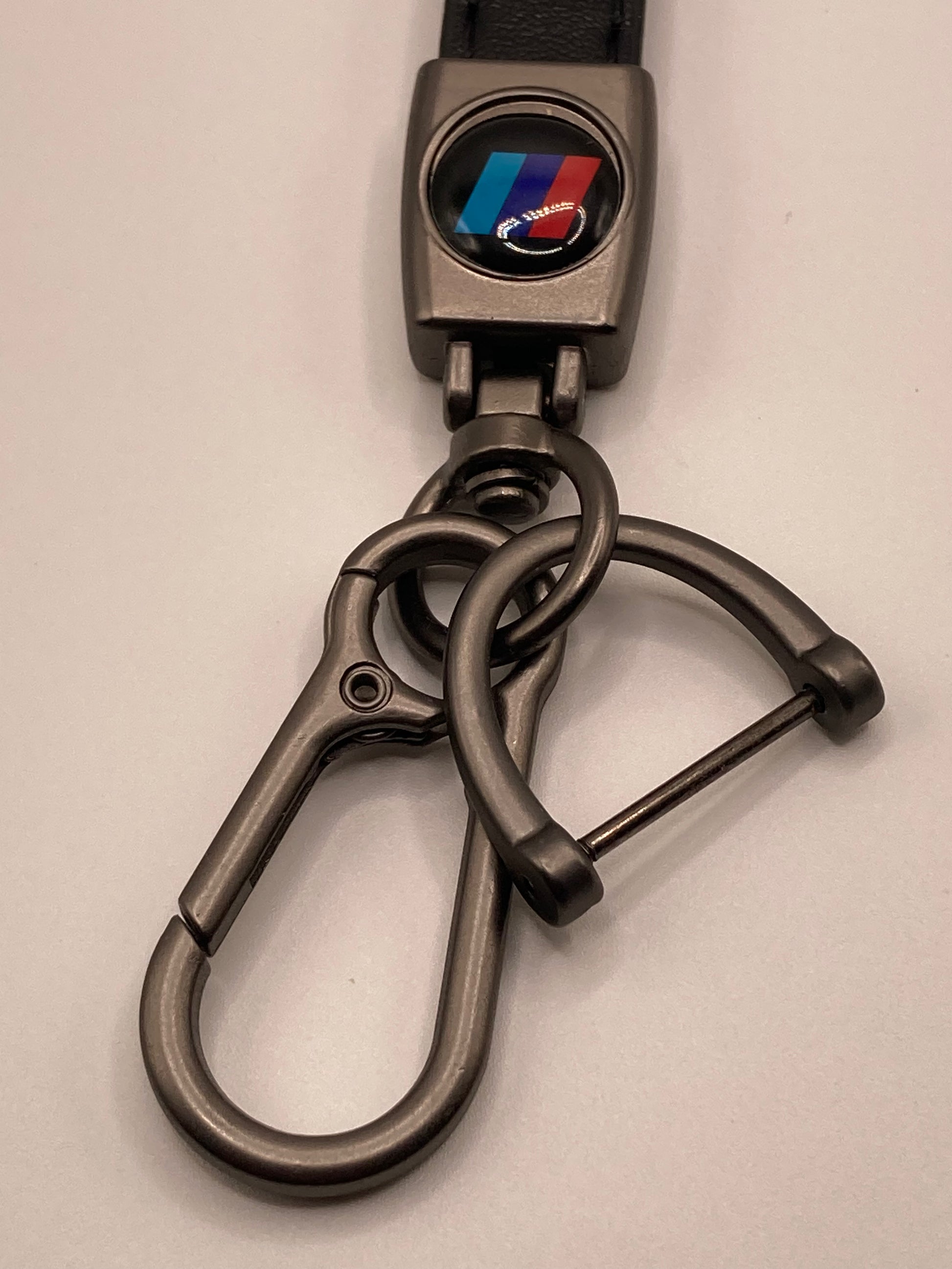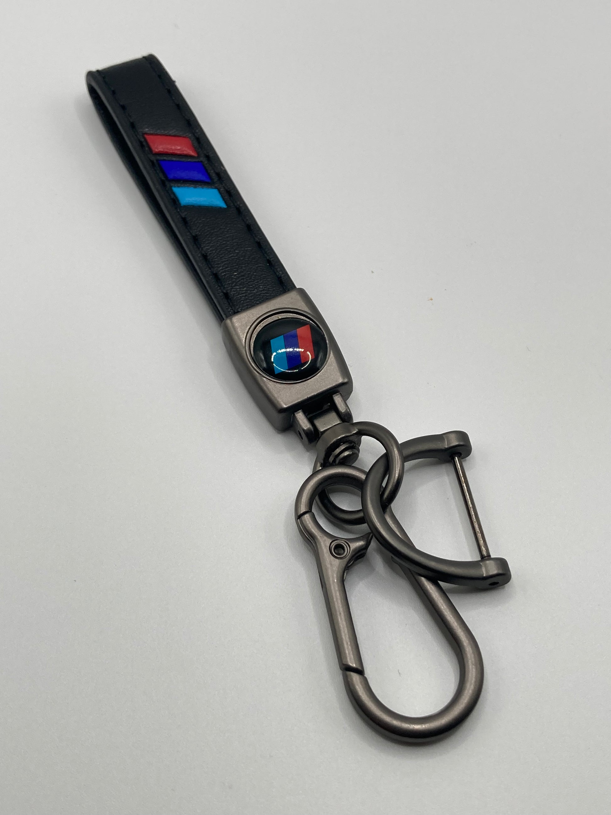 Black Leather Keychain with Tri-Color logo - keychain has a high quality leather strap and sturdy metal hardware. Includes a sturdy clip and an attachment for your cars key fob. Hardware has a tri-color logo. Great way to show off your keys.